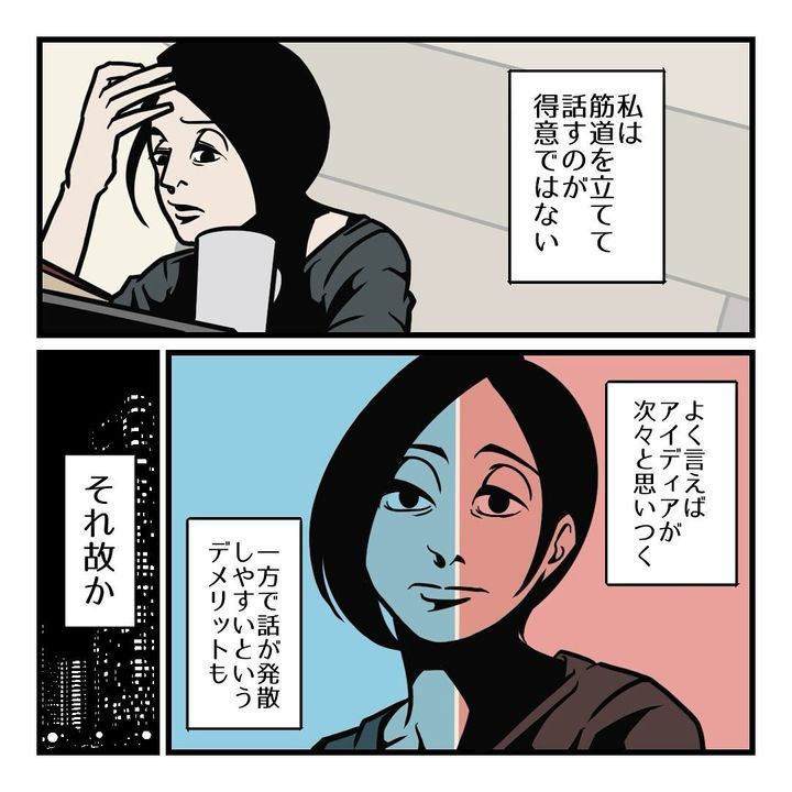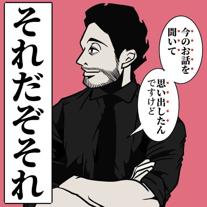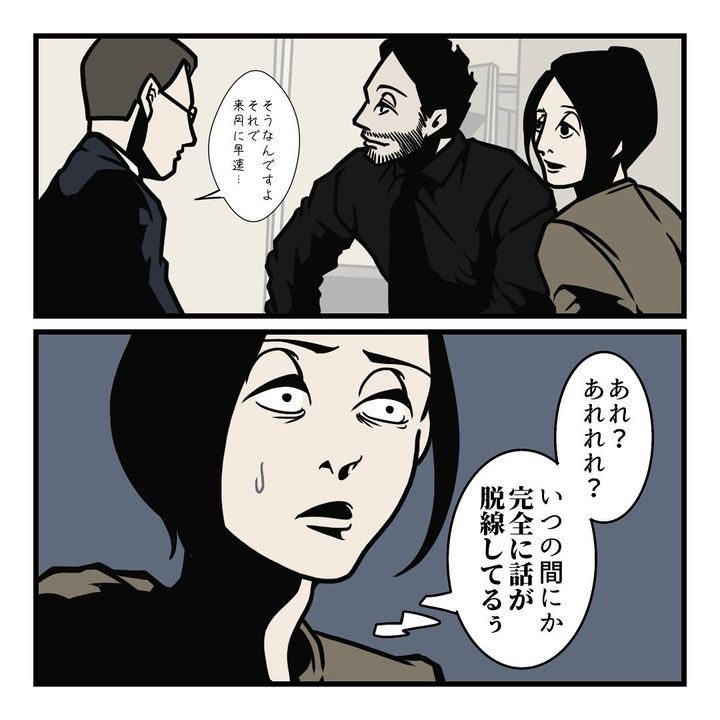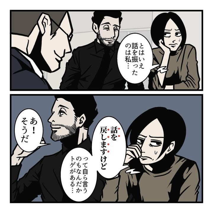 打ち合わせ相手の話が脱線するも、「とはいえ話を振ったのは私…話を戻しますけどって自ら言うのもなんだかトゲがある…」と、逡巡するB.B軍曹さん。そんな状況で、髭さんは、「今のお話を聞いて思い出したんですけど」と、相手に失礼がない言葉で見事に話題を変えるでした。
