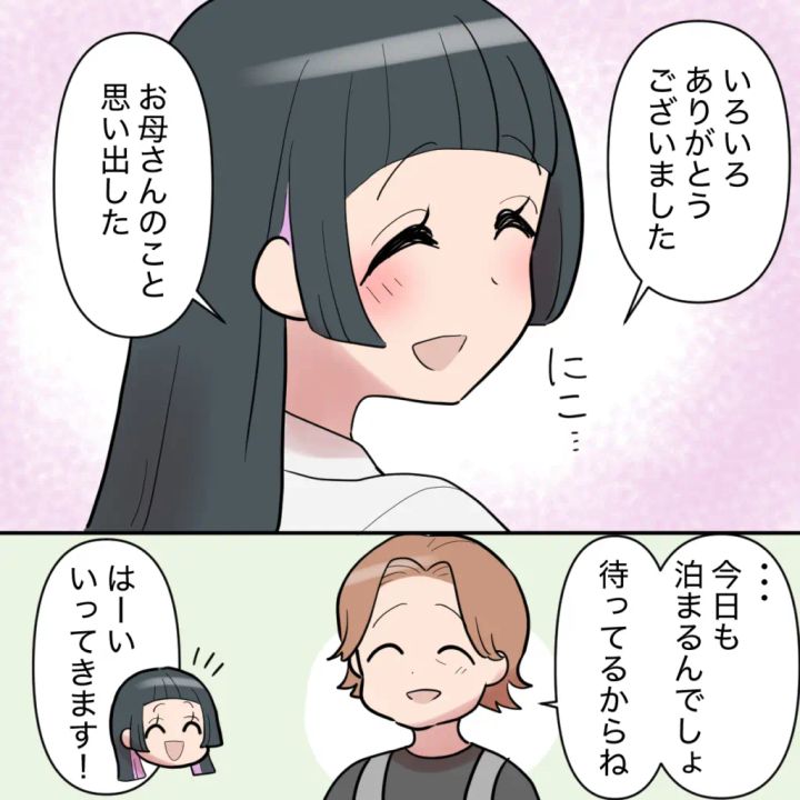 エリカちゃんは「いろいろありがとうございました。お母さんのこと思い出した」とはにかみながらにこっと笑顔でお礼を言ってくれ、私も自然と笑顔になり「・・今日も泊まるんでしょ。待ってるからね」と返すと、「はーい。行ってきます!」と元気に登校していきました。