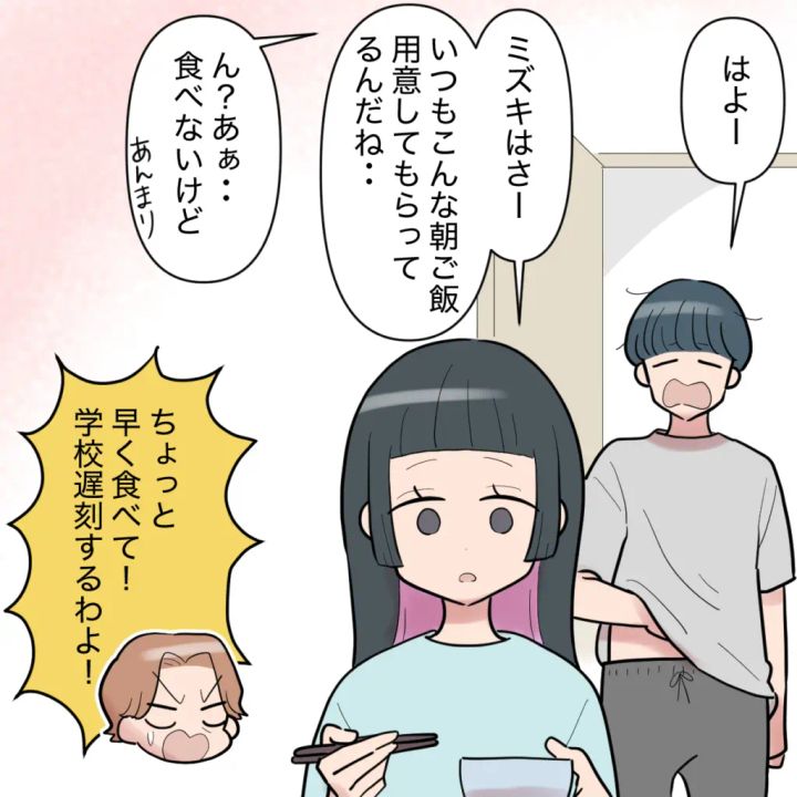 しばらくすると、「はよー」とあくびをしながらミズキが起きてきました。「ミズキはさー、いつもこんな朝ご飯用意してもらってるんだね・・」と独り言のように呟くエリカちゃんに「ん?あぁ・・食べないけど、あんまり」と言いながらのそのそと席につくミズキ。のんびり起きてきても全く慌てる様子のないミズキに「ちょっと早く食べて!学校遅刻するわよ!」とこっちがヒヤヒヤ。