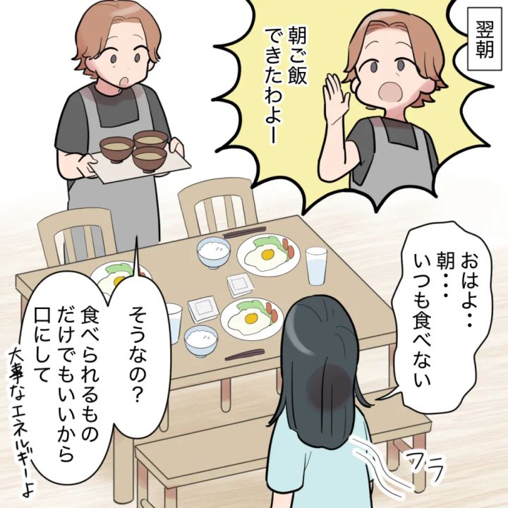 翌朝、「朝ご飯できたわよー」と声をかけると、フラフラしながら起きてきたエリカちゃんが「おはよ・・朝・・いつも食べない」と言うので「そうなの?食べられるものだけでもいいから口にして。大事なエネルギーよ」と少しでいいから食べるように伝えました。