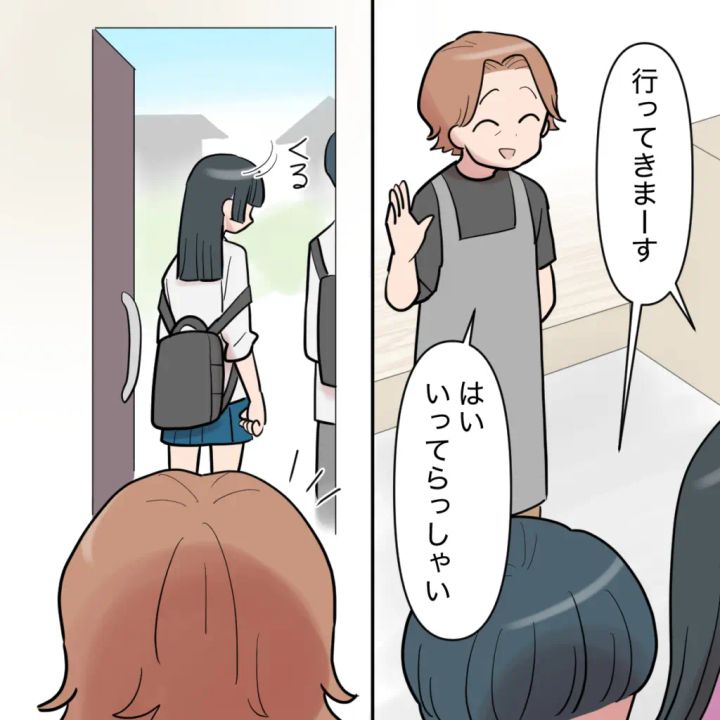 あっという間に家を出る時間になりました。「行ってきまーす」と揃って家を出る二人を「はい。行ってらっしゃい」と見送っていると、玄関を出たエリカちゃんがくるっと振り返りました。