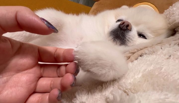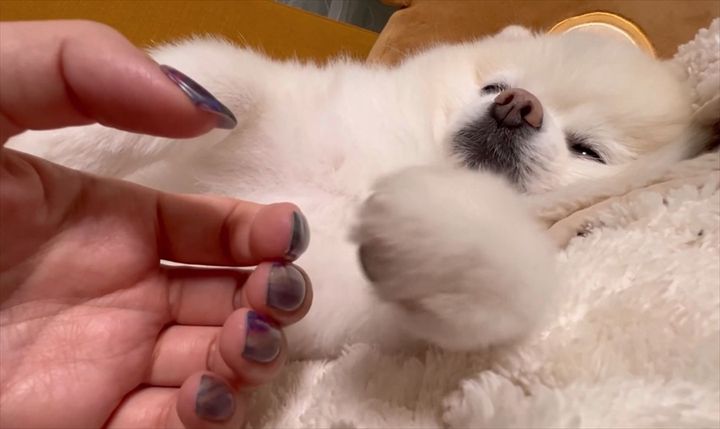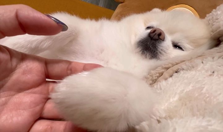 3. おててをつないでと甘えるポメラニアン。ウトウトしている姿がかわいいと話題に「おててがかわいい」「エア繋ぎさせてもらいますワン」