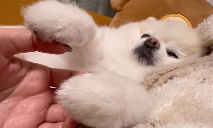 眠る前に飼い主さんに甘えるポメラニアン。 おててをつないでほしいとアピールする姿が話題となっています!