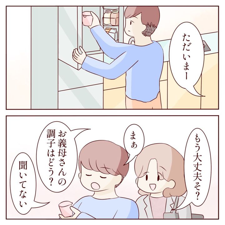 「もう大丈夫そ?」と聞くと、「まぁ」とマサキ。「お義母さんの調子はどう?」とたずねると、「聞いてない」と素っ気ない答えが返ってきました。
