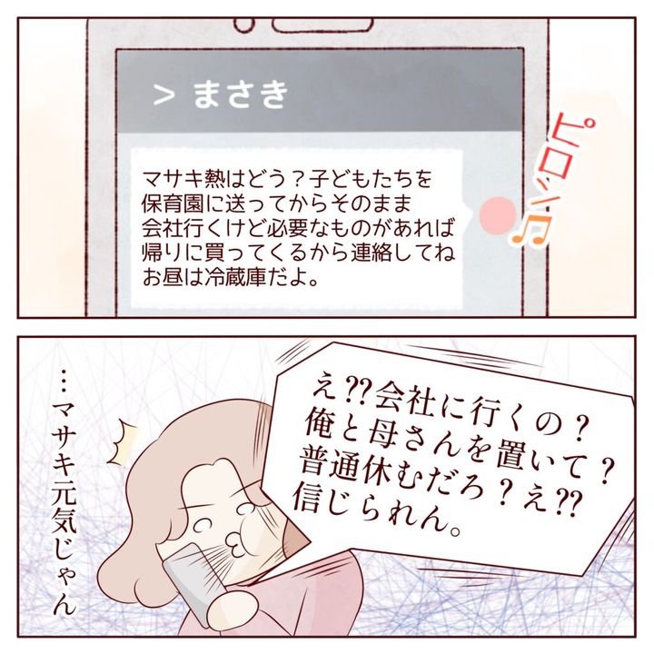 「マサキ熱はどう?子どもたちに保育園に送ってからそのまま会社に行くけど、必要なものがあれば帰りに買ってくるから連絡してね。お昼は冷蔵庫だよ」