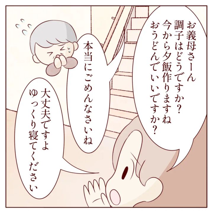 そして、「お義母さーん!調子はどうですか?今から夕飯作りますね。おうどんでいいですか?」と大きな声を出すと、「本当にごめんなさいね」と2階の寝室から声が。「大丈夫ですよ。ゆっくり寝てください」と義母に声をかけ夕飯の支度をすることにしました。