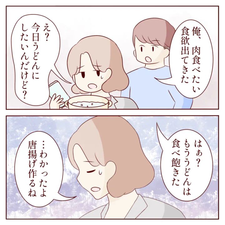 すると、「俺、肉食べたい。食欲出てきた」とマサキが言い出し、「え?今日うどんにしたいんだけど?」と言うと、「はぁ?もううどんは食べ飽きた」マサキにそう言われ、「・・わかったよ。から揚げ作るね」と呆れて答えました。