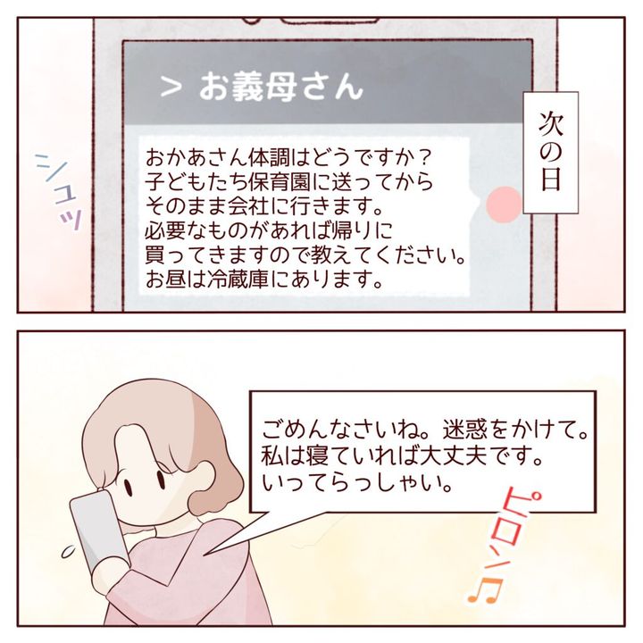 モエさんの夫マサキさんは2年前から体調が悪くなるとわざわざ義母を呼んで看病してもらうように。義母はすぐに飛んできて泊まり込みで甲斐甲斐しく看病します。マサキさんが熱を出し、モエさんは2歳タクミくんと0歳ソウタくんのお世話を一人でしながらできる限りの看病をしていましたが、「全然看病してくれなかった」と不服そうでした。義母は、食事に洗濯に薬にと世話を焼き、完治したマサキさんは「モエは看てくれないからまたお願い」とマサキさんが嫌味を言いモエさんは困惑。その後マサキさんが義母を呼び、「何か必要??」と部屋へ行った義母は、家にあるのじゃないゼリーが食べたいって言うから買って来ると夜遅くに出かけて行く義母。「別にいいだろ?買って来てくれるんだから」と平然と言うマサキさんにため息しか出ませんでした。翌朝、なんだか体が重いと言う義母。心配になり、会社を休み病院に連絡し、義母を必死に看病したモエさんに、「母さんだと会社休んで看病するんだな。俺の扱いが酷いってわかった」とマサキさんからメッセージが届き、「なんでそうなる??」と開いた口が塞がりませんでした。