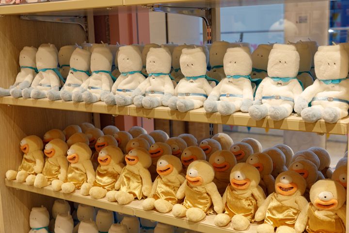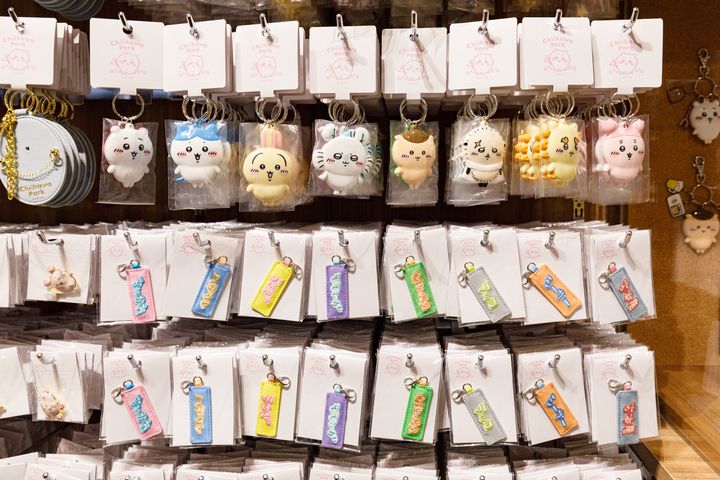 ショップエリアでは、ちいかわパーク限定グッズをはじめ、さまざまなアイテムが並ぶ。好きなパーツを組み合わせて名入れできるなど楽しいコーナーもめじろおし。