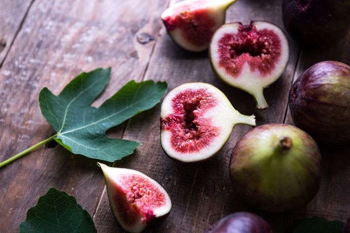 Fresh purple fig fruit and slices with leaf on old wooden background
