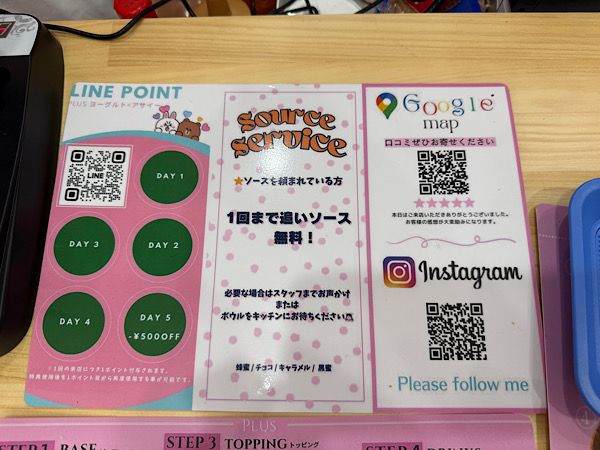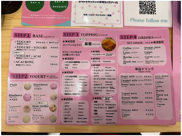 ツウな方はこちらから全チョイスして注文することもできます。 ヨーグルトフレーバーの種類もレギュラーで8種類あり豊富です。 トッピングのフルーツが豊富です。しかもフルーツ3種類以上で50円トッピング1つをサービスしてもらえます。中でもおすすめなのが巣蜜(400円)です。しっかりとした弾力のある芳醇な蜂蜜です。