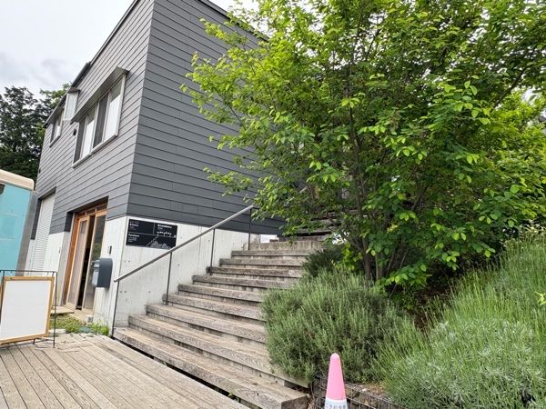 緑に囲まれた場所にたくさんの階段がある。上るとリニューアルオープンのカフェ杜と雫の入り口に到着。