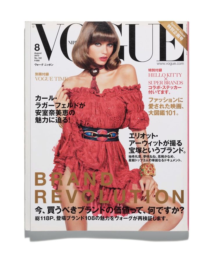 ブランドの価値って、なんだろう? リーマンショックの打撃から世界が未だ回復していない中で組まれた2010年8月号の「BRAND REVOLUTION」特集で、当時の編集長は繰り返しそう問うている。真摯な問いからは、『VOGUE NIPPON』(当時のタイトル)を率いる使命感と矜持も窺える。単なる消費ではなく他人の模倣でもなく、時代の空気を身に纏い、自ら新しい風となる喜びに多くの人が出会えますように。特集は、そんな祈りの込められた濃密な内容だ。ハイブランドのデザイナーたちへのロングインタビューに加え、自身がデザインしたフェンディの服に身を包んだ安室奈美恵をフォトグラファーとしてカール・ラガーフェルドが撮影した作品や、エリオット・アーウィットが宝塚スターを撮った写真も掲載されている。安室奈美恵や宝塚は「ほかに代わるものがなく、時間をかけて誰にも追いつけない価値を生み出したもの」で、「ブランドの存在価値は同じ時代を生きる私たちの誇り」だと編集長は綴る。