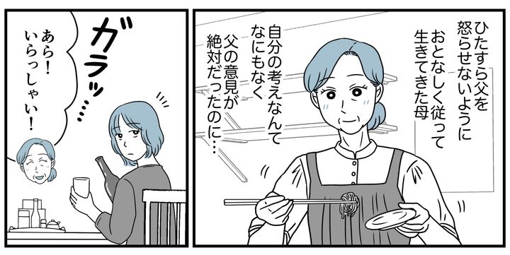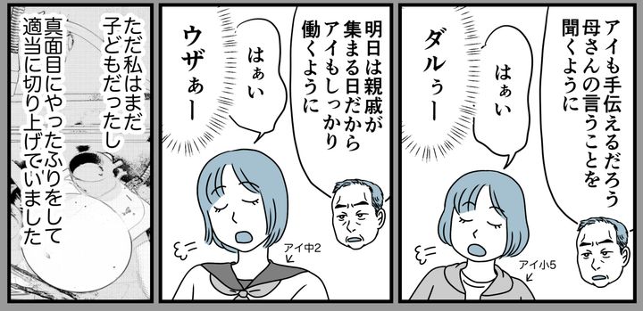 私はアイ(28)。結婚して夫と2人暮らしです。私はずっと損をしないように立ち回り、誰かの言いなりになるお人好しはバカだと見下していました。母のような生き方をしたくなかったからです。幼い頃から両親が営むお寿司屋さんでは、季節ごとに大勢の親族を集めて大宴会。あるとき私は遠い親戚の男の子を叩いたと勘違いされ、父から物置に閉じ込められます。しかし母は私を助けるよりも、父に従うことを優先して……。あのときの絶望は今でも忘れられません。