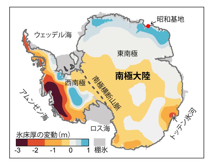 氷床の増減は衛星で継続的に南極の標高を計測して判断しているんですが、標高データだけでいえば、西南極ではどんどん氷床が融けて減少しているのに、逆に昭和基地がある東南極では増加しているように見えるんです。