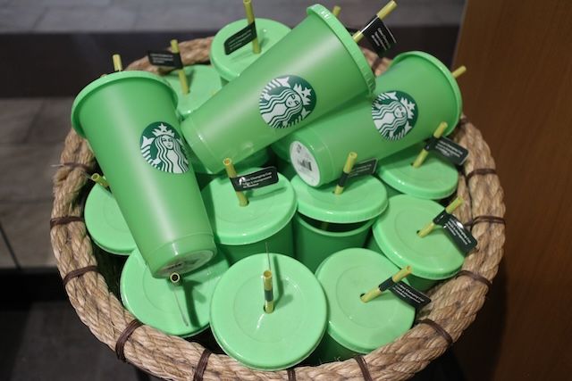 緑のスターバックスのリユーザブルカップ(再利用可能なカップ)を発見!普通のカップかなと思ったら、なんと冷たい飲み物を入れるとオレンジ色に色が変わる楽しいアイテムなんだとか!