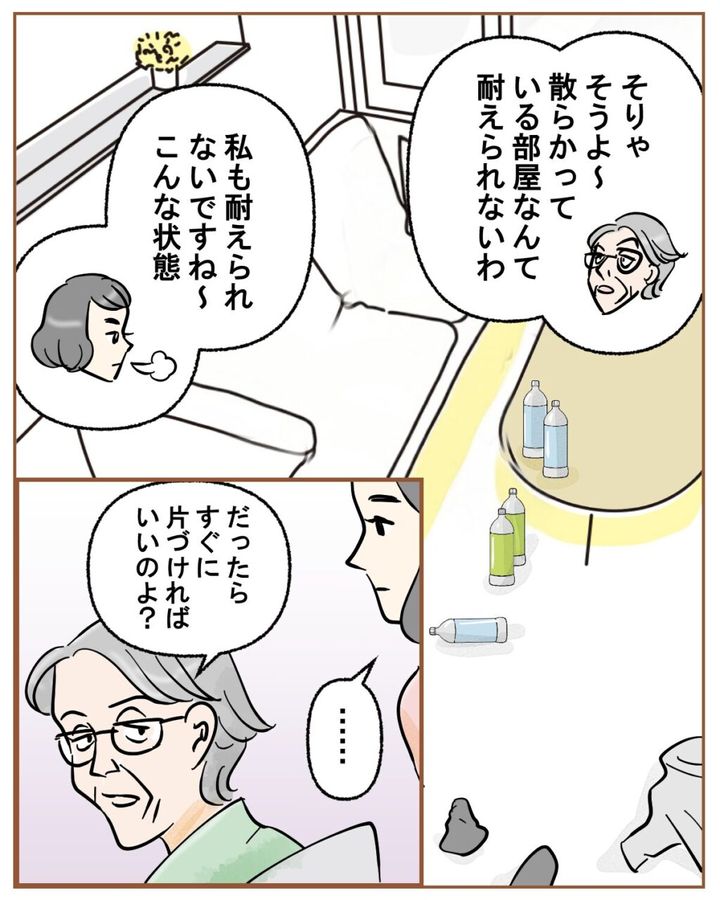 息子に褒められた義母が上機嫌で「そりゃそうよ~。散らかっている部屋なんて耐えられないわ。」と言ったので、すかさず私も「私も耐えられないですね~こんな状態。」と同調しました。すると「だったらすぐに片付ければいいのよ?」と義母がくるりと私に振り返って言いました。