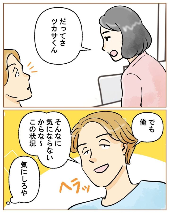 負けずに「だってさ、ツカサくん。」とわざとツカサに言っても、「でも俺、そんなに気にならないからな~この状況」とツカサはヘラヘラ笑うだけです。心の中で(気にしろや)とツッコミを入れてしまいます。