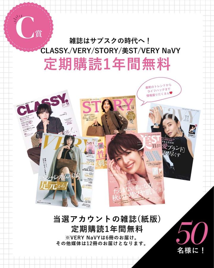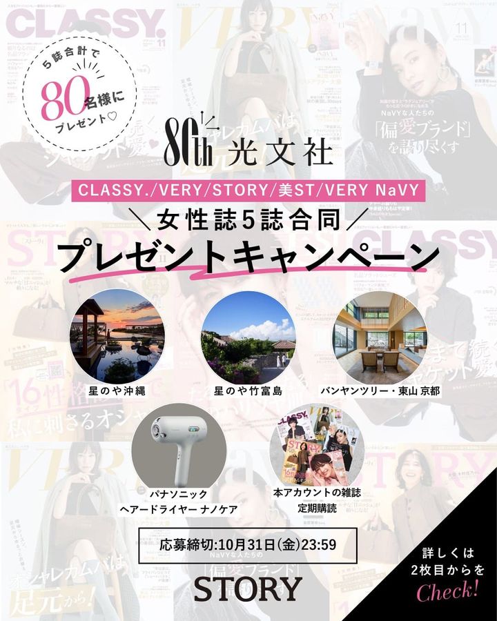 日頃ご愛読いただいている読者のみなさまに感謝の気持ちを込めて、『CLASSY.』『VERY』『STORY』『美ST』『VERY NaVY』の女性誌5媒体の公式Instagramにて、プレゼントキャンペーンを実施させていただきます。