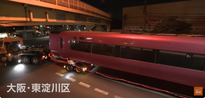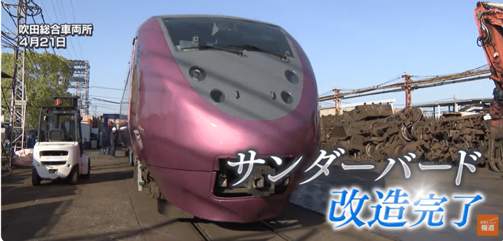 そして4月下旬、ついに「サンダーバード」の改造が完了。白やグレーだった外装はキラキラの“紅梅色”に。中はカーペットや荷物棚が取り外され、何もない状態になった車両が、大阪・吹田から京都・梅小路へと運ばれます。