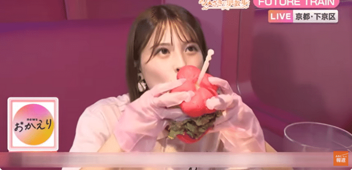 さっそく試食する大仁田アナは、梅の花のような赤いバンズにすき焼きをたっぷりサンドしたハンバーガーや、ピンクの五重塔がそびえ立つボリューム満点パフェなどを堪能。そのおいしさと“映え”必至のキュートさに大満足の様子でした。