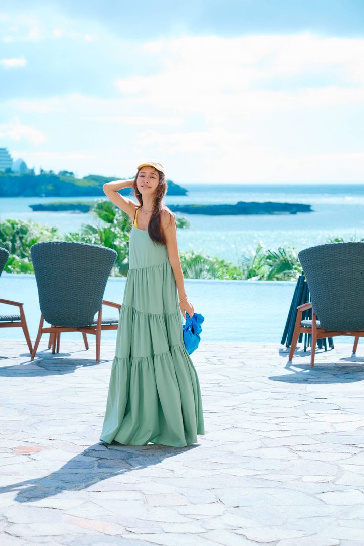 バカンスといえば、一枚で華やかに映えて、しかもラクちんなロングワンピが相棒。背中が大きく開いた肌見せワンピも、水着となら思い切り楽しめそう! ワクワク心が躍るようなカラーミックスコーデがコズさん流。