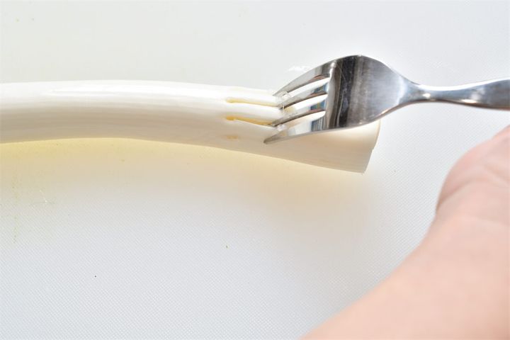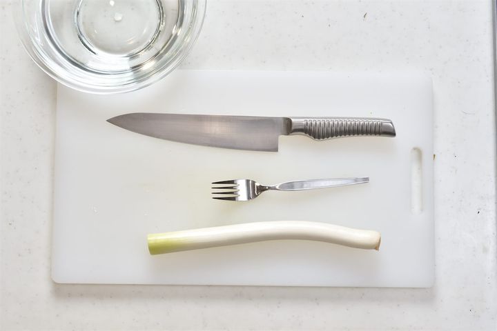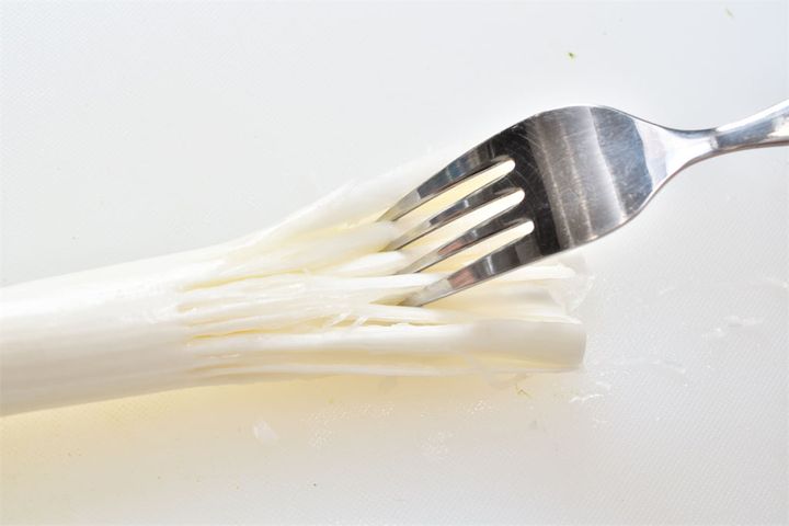 1. 長ねぎの白い部分にフォークを突き刺し、フォークを引いて繊維を割く。