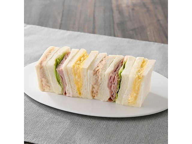 ひとくちサイズの食べやすいBOXサンドです。たまごサラダサンドとハムレタスサンド、ツナサラダサンドの3種類の彩りの良い詰め合わせです。