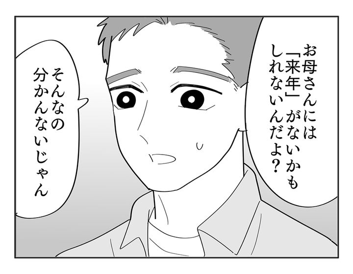 お母さんには「来年」がないかもしれないと、涙ながらに語るエリさん。確かに大きな病気が見つかった以上、この先どうなるか分からないのは事実ですよね。でもコウタさんは「孫の成長を見たい気持ちは同じ」と主張します。「来年」がどうなるのか分からないのは、誰にでも言えること。怒りが収まらないエリさんは、少々感情的になりすぎてしまっているのかもしれません。
