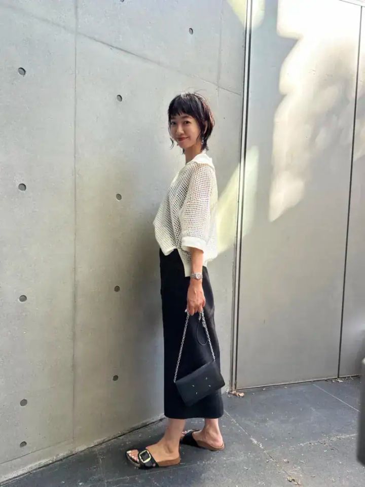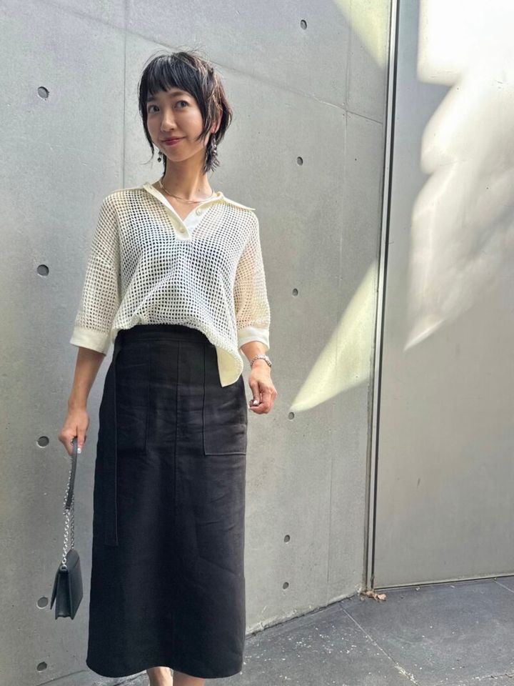 夏は、素材選びも心地よく着こなすために重要! 透けニットのトップスにリネンスカートで、リラックス感のあるスタイリング。トップスはニット編みのポロシャツをチョイス。タイトなシルエットのスカートを合わせることで、ちょっぴりモードな雰囲気も漂います。