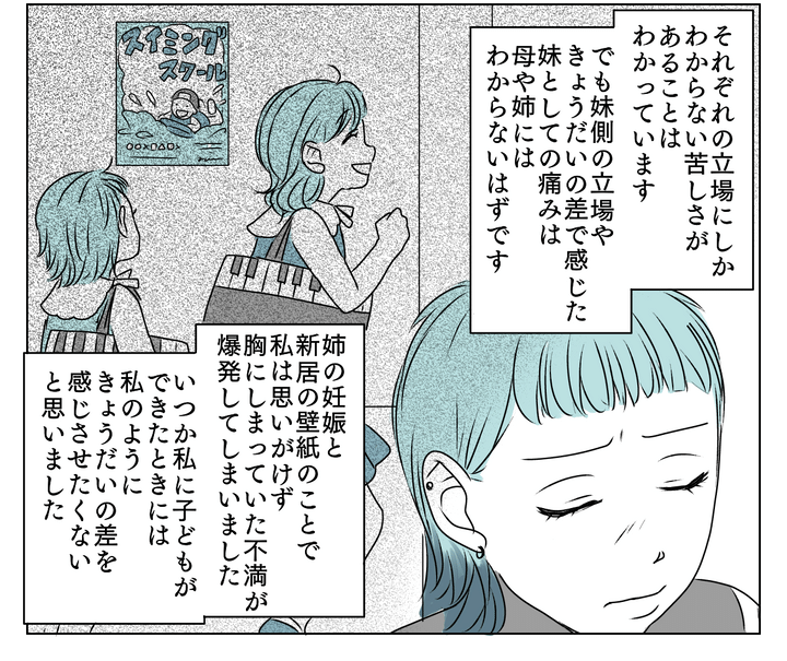 姉の妊娠と壁紙をきっかけに、私は胸にしまっていた感情と向き合うことになりました。たとえ周りが私と姉が同じ状況だったと言っても、私からすると差のある状況だったのです。