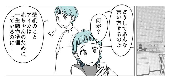 私(ユイ、26歳)は独身の会社員。実家で父と母(マキエ、50代後半)と暮らしています。近所に住む姉(アイカ、28歳)は第1子を妊娠中で、戸建ての新居を建てる予定です。姉はお腹の子の名前を「ルナ」にすると決めており、新居の壁紙選びで「LUNA」という壁紙を見つけたと嬉しそうに報告してきました。でも姉が下の子の気持ちを考えていないように見えた私は、思わず嫌悪感をぶつけてしまったのです。
