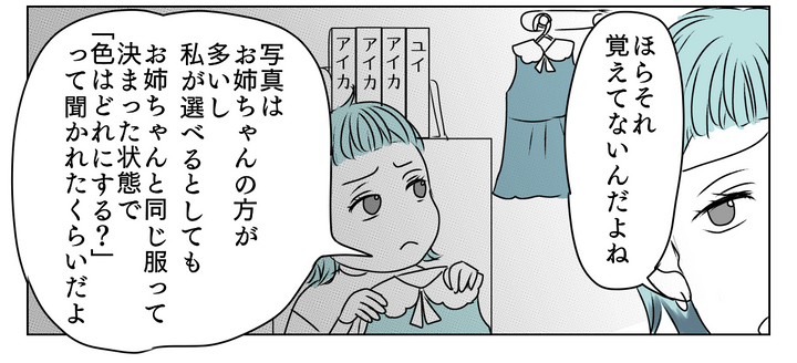 どうやら、母は私と姉に差をつけていたことを覚えていないようです。写真は明らかに姉の方が多いし、服を買うときも色くらいしか選ばせてもらえなかったのに……。