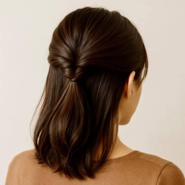 トップがぺたんこになりがちな大人世代にぴったりなのが、「ハーフアップ+くるりんぱ」アレンジ。耳上の髪をとって後ろでひとつに結び、結び目をくるっと内側に巻き込むだけで、立体感のある美シルエットが完成します。