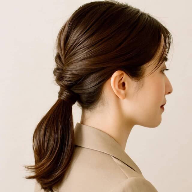 疲れて見えがちなローポニー(低めのひとつ結び)も、サイドにひとねじりを加えるだけで見違えるほどこなれた印象に。