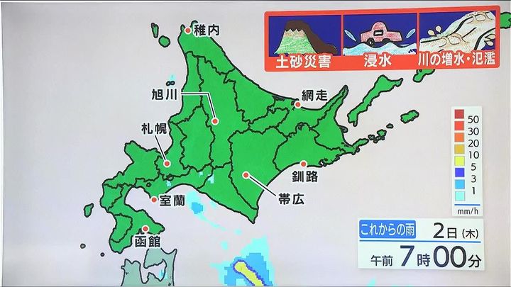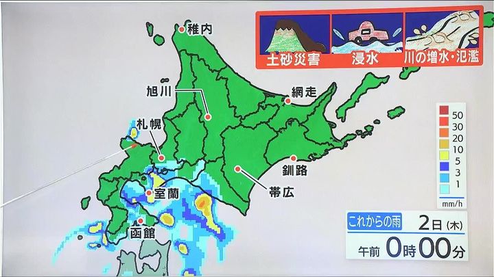 また、「記録的短時間大雨情報」という、数年に一度程度しか発生しないような短時間の大雨、だいたい1時間に100ミリ前後の雨を観測したり、レーダーで解析したりしたときに発表される情報が白老町付近には2回、黒松内町付近でも1回発表されました。