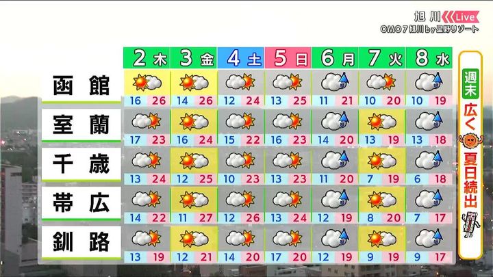 週末は晴れて、函館や帯広など25度前後まで気温が上がるでしょう。月曜日の雨が季節を大きく進め、来週は日中でも20度に届きません。体調管理に気を付けて下さい。