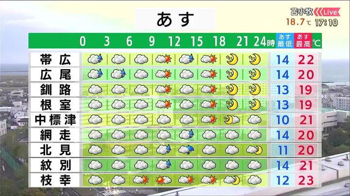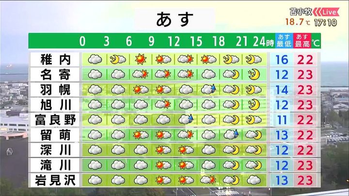 昼頃は富良野など内陸で、夕方以降は留萌など海岸部でにわか雨があるでしょう。最高気温は22度前後と高めの状態が続きます。