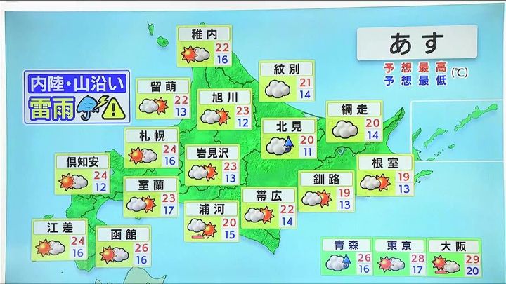 日が差しますが、北見など内陸や山沿いの所々で雷雨のおそれがあります。空の様子に注意して下さい。気温はきょう1日(水)と同じくらい。函館では26度の夏日の予想です。