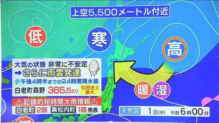 寒気が流れ込んだため、上空と地上付近の気温差が大きい。つまり大気の状態が非常に不安定になり、さらに雨雲が発達しました。胆振の白老町森野では、午後4時半までの24時間に10月の観測史上最大となる365.5ミリの雨が降りました。
