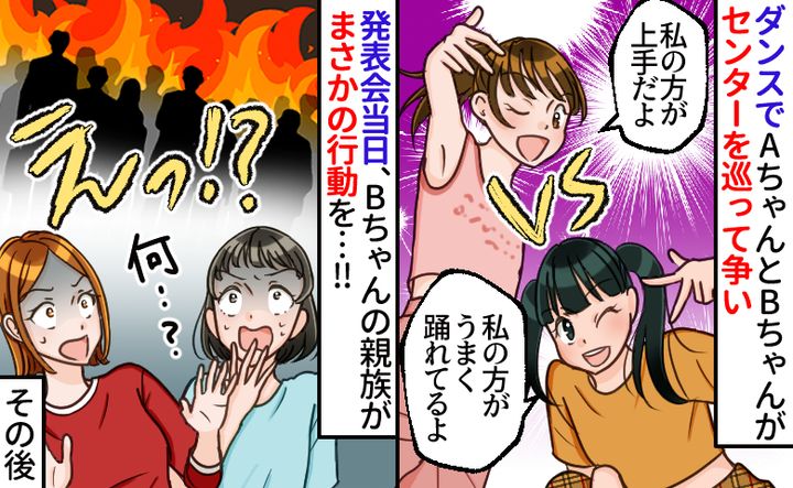 娘(8歳)のダンス発表会で、センターの座をめぐる争いが起こりました。じょうずな子が2人いて、1人は圧倒的な実力を誇るAちゃん、もう1人はAちゃんには及ばないものの表現力のあるBちゃんでした。センターはAちゃんになりましたが、Bちゃん親子は快く思っていなかったようで……。
