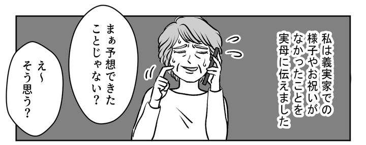 義実家を訪れて、あらためて(やっぱりちょっとヘンな家だな)と思いましたが、もちろん夫には言えません。これからも義実家と関わることがあると思うと、不安です。モヤモヤが晴れない私は、帰宅後実母(リツコ、60代)に電話で聞いてもらうことにしました。