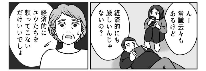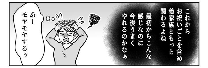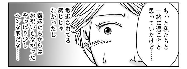 経済的な事情があるのかもしれませんが、義家族の常識やマナーのなさにはやはりモヤモヤします。私の実家と比べるほど価値観の違いが浮き彫りになり、これからの付き合いを思うと早くも気が重くなりました。