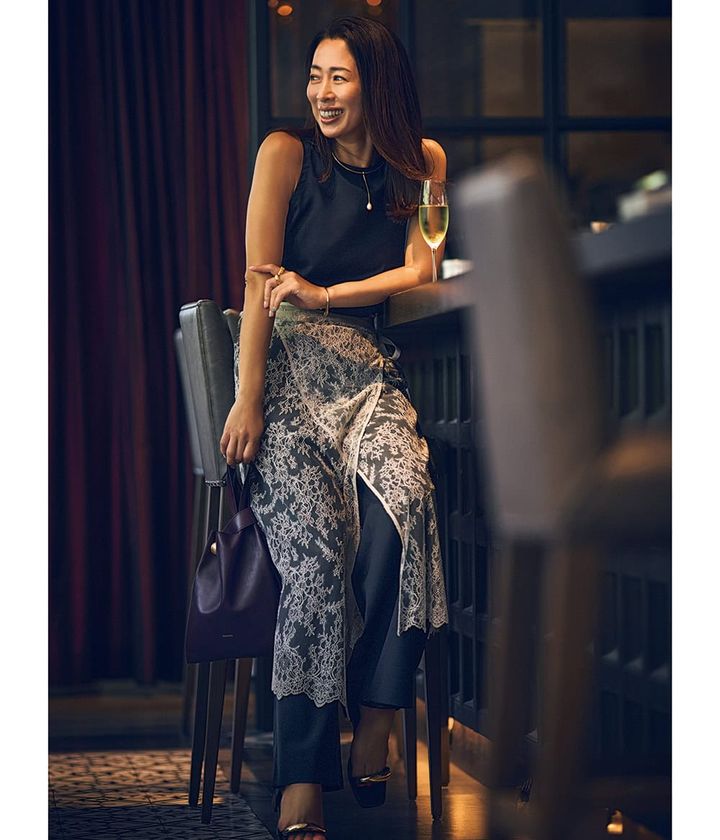 レーススカート¥35,200(カオス/カオス丸の内) ブラウス¥26,950 パンツ¥35,200(ともにロエフ/エイチ ビューティー&ユース) バッグ¥42,900(オルセット/オルサ) サンダル¥15,400(ダイアナ/ダイアナ 銀座本店) ネックレス¥45,650(プラウ) ピアス¥38,280〈フェルセラ〉 リング[2個セット]¥39,160 バングル¥32,560(すべてZUTTOHOLIC)