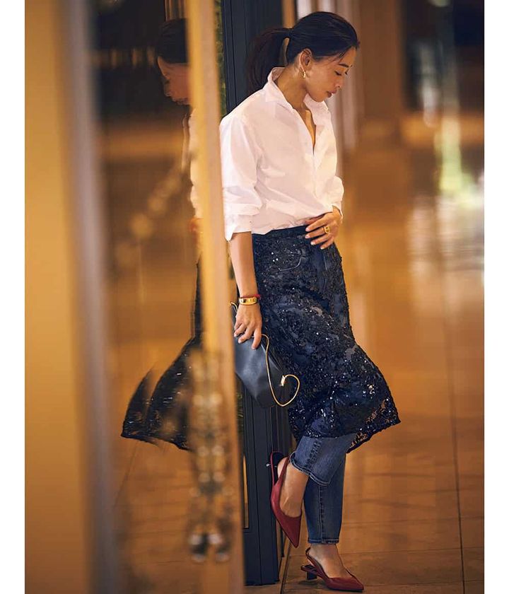 スパンコールスカート¥39,600(バウム・ウンド・ヘルガーデン/S&T) シャツ¥38,500(ロエフ/エイチ ビューティー&ユース) デニムパンツ¥25,300(レッドカード トーキョー/ゲストリスト) バッグ¥75,900(マエストソ/アマン) パンプス¥178,200(ピエール アルディ/ピエール アルディ 東京) ピアス¥7,040〈エムシー・スタジオ〉 リング¥37,180 ゴールドバングル¥39,160〈ともにソコ〉 赤ビーズブレスレット¥5,500〈ペラペラック〉(すべてZUTTOHOLIC)
