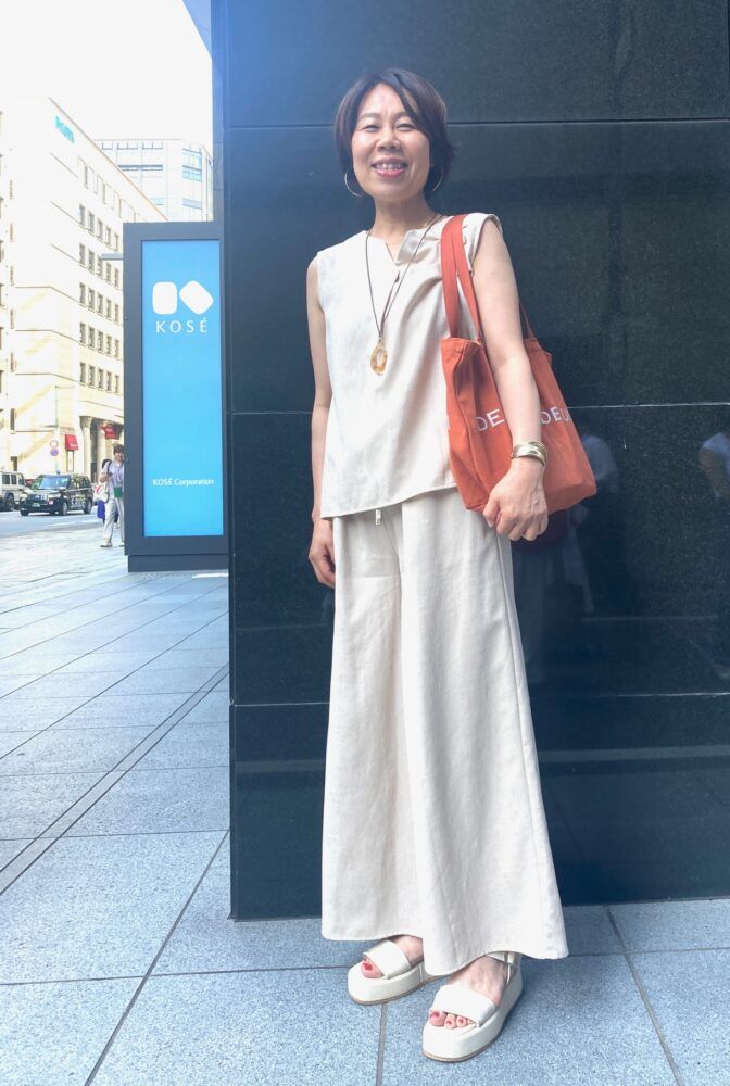素敵なあの人のイベントに、初めて参加された山本さん。「『ベーセーストック』の明るめベージュのセットアップで涼やかに。すっきりした印象なので、首元や顔まわりは落ち着き感のあるアクセサリーをプラスして、大人カジュアルにまとめました。ボトムスはスカートに見えて実はワイドパンツなんです。普段からパンツが多めですが、お出かけのときはスカート見えするワイドパンツを選び、きれいめな着こなしになるよう心掛けています」