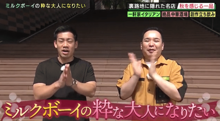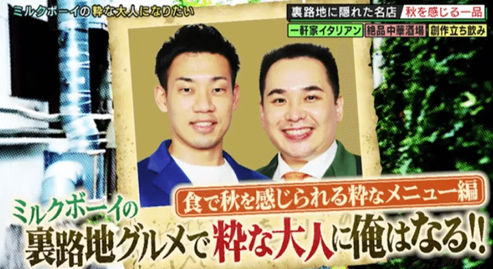 アラフォーのミルクボーイが粋な大人を目指す好評企画「ミルクボーイの粋な大人になりたい」。今回は、1年ぶりとなる“裏路地グルメ”編。関西の名だたる人気雑誌の編集者から提供された情報をもとに、ワンランク上のかっこいい大人が通う路地裏の名店を訪ね、旬の食材を使った“秋を感じられる粋なメニュー”を味わう。