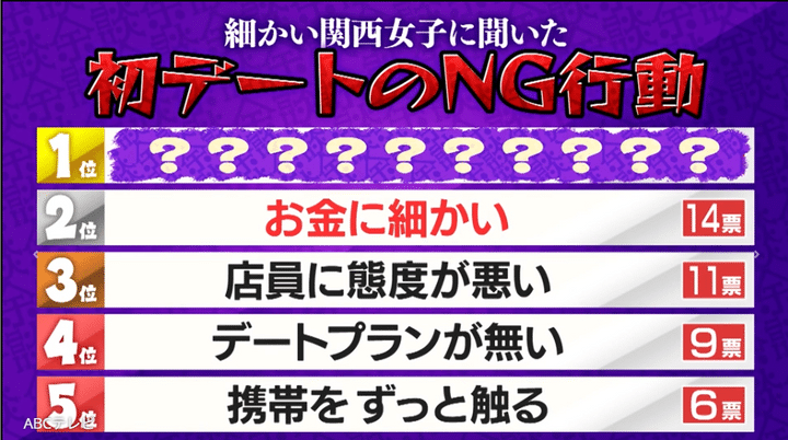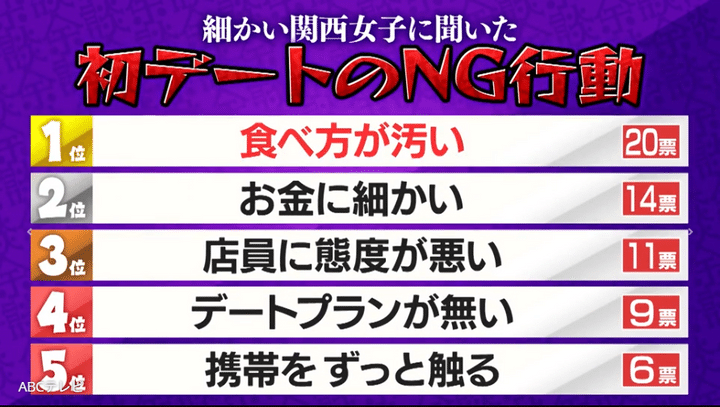 【TVer】関西女子に聞いた!初デートで「この男アカンかも」と思うNG行動を余談調査!「店員に態度が悪い」「お金に細かい」よりも嫌われ、第1位になったのは?