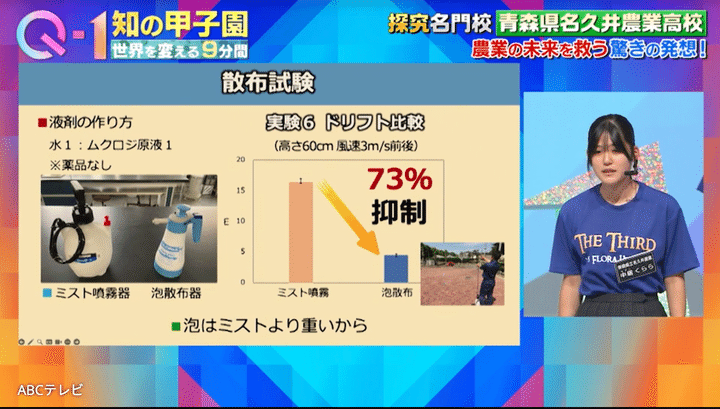 最後は、『青森県立 名久井農業高等学校 栽培環境班』。彼らの問題提起は「農薬」。農業では欠かせないものではあるが、散布時に必要のないところにも飛散してしまう。
