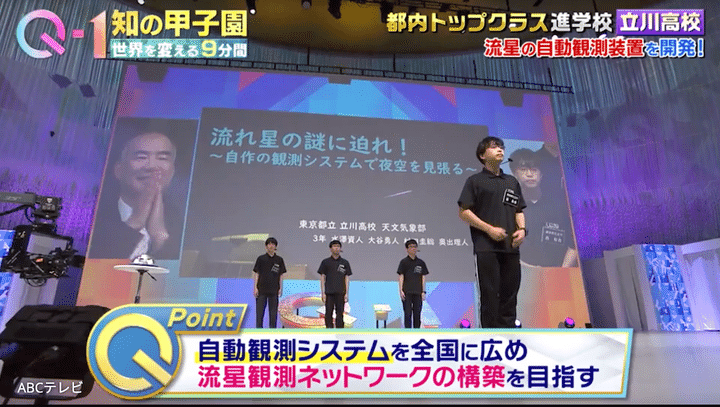 昨年の『Q-1』でもベスト8に選ばれた同部。今年のテーマは、流星の自動観測に着目した「ビデオ自動観測装置の開発」。天文学者の日本大学・阿部新助教授によると、流星の観測で謎を解明するというのは、世界的な宇宙探査ミッションをも動かすことになるのだという。